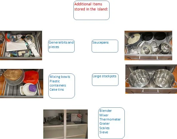 We feel that we have a fully stocked kitchen but are aware that it is not always easy to find certain things in a new kitchen so please see the picture below which shows where various thinmgs are stored. Please try to return items to the correct place so that the next guests are also able to find them!